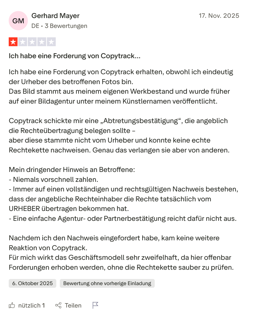 So schreibt beispielsweise Gerhard Mayer, dass er eine Forderung von Copytrack erhalten habe, obwohl er eindeutig selbst der Urheber des betreffenden Fotos sei.